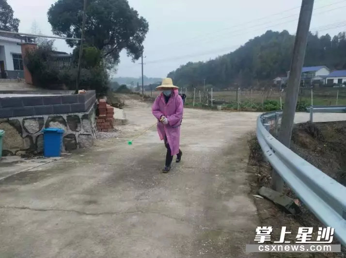1月27日上午,安沙镇万家铺村尧塘冲组村民杨永胜背上自家的药壶,在为组内十余户居民义务喷洒消毒药水。这也是他从大年初一开始,连续第三天进行喷药消毒作业了。
