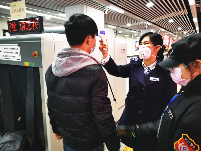 1月28日,在长沙火车南站进入地铁2号线入口处,长沙地铁工作人员正使用体温枪对进站乘车乘客进行体温测量,一旦发现有发热情况的乘客将做好劝免乘车工作并及时登记上报。