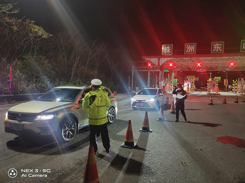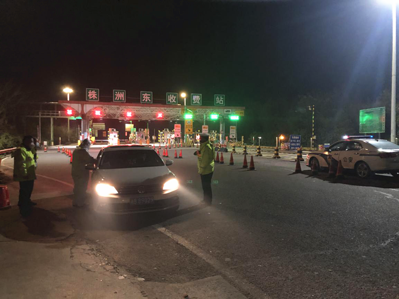 “您好,麻烦您靠边停车配合检查。”1月28日晚10时,株洲市公安交警支队荷塘大队民警在株洲东收费站出口处设置卡点,对出站车辆进行逐一登记、劝返湖北牌照车辆,并配合交通、卫生、街道等单位工作人员对入城车辆司乘人员进行体温测量。