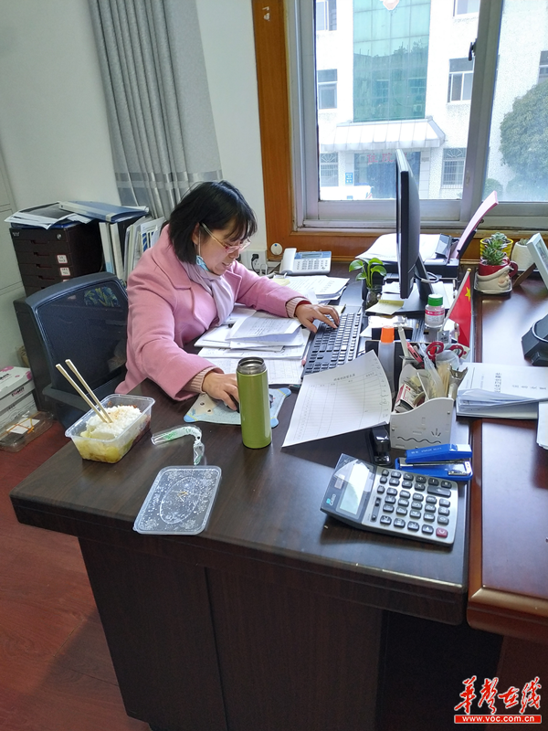 她叫李红,医救中心的文秘,她负责防控工作的协调、材料汇总上报等。自疫情防控工作开展以来,她每天从早上8点一直忙到晚上8点,没有时间喝水,没有时间吃饭。这不,刚喝了一口水,饭还没来得及吃,又接到新任务开始忙碌起来。她说:“比起在一线的工作人员,我已经轻松很多了,他们也经常错过饭点还要熬夜,我只有把自己的事情做好,保障好他们的后方,才能让他们有更多精力去面对各种突发情况!”