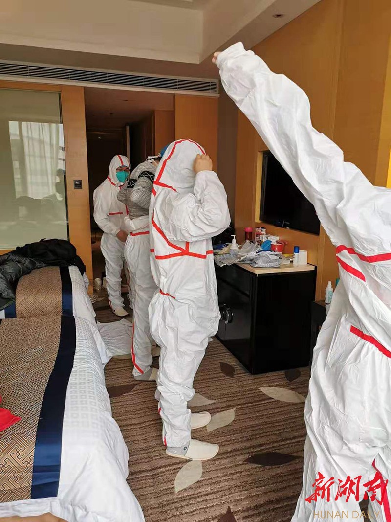 高纪平介绍,抵达黄冈后,医疗队召开了全体队员大会,开展了新型冠状病毒感染的肺炎和医院感染的控制、新型冠状病毒感染防控,以及手消、防护口罩、防护服穿脱等培训。队员练习穿脱防护服,人人都要过关。为了顺利穿脱防护服,女队员都把长发剪为短发;为了预防感染,驻地宾馆每个队员的宿舍区分为三区,污染区、半清洁区、清洁区。