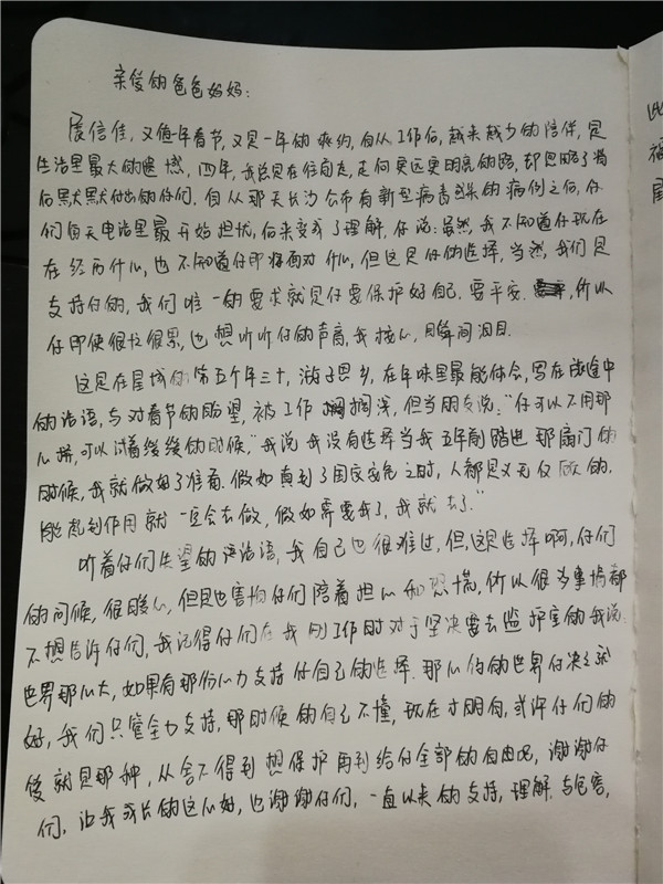 华声在线1月27日(记者 李昆励 通讯员 粟青梅 陈盼)随着抗击新型冠状病毒感染的肺炎战役打响,长沙市中医医院(长沙市第八医院)全体医护人员正全力以赴日夜奋战,与时间赛跑。面对来势汹汹的疫情,许多人自愿放弃了春节休假,坚守在工作岗位上,时刻准备与病毒奋战到底。他们向家人写下一封封特别的“家书”。