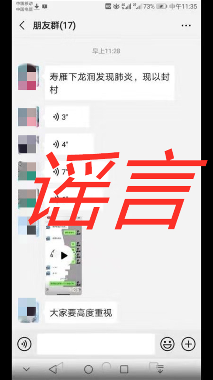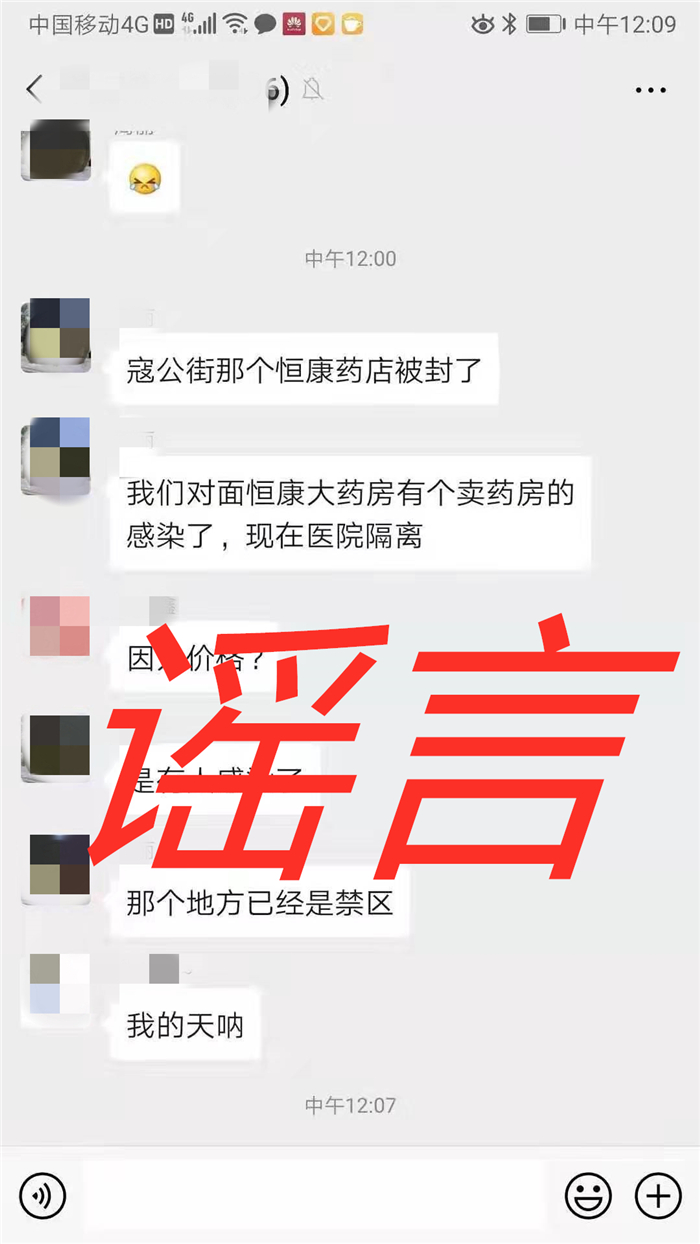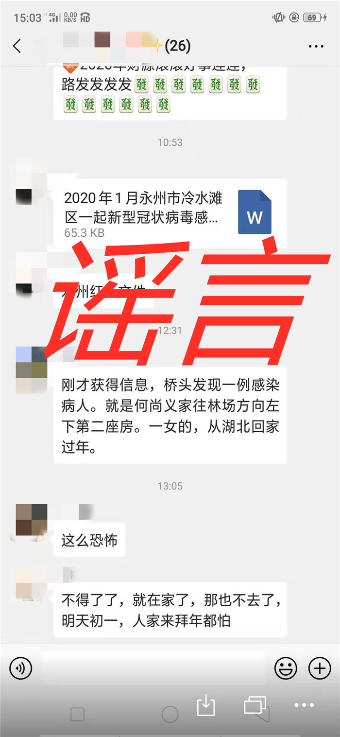红网道县分站1月26日讯(记者 毛黎明 通讯员 刘跃胜)1月25日以来,本地部分微信群、朋友圈内传播着“道县寇公街恒康大药房有人感染新型冠状病毒被隔离”“寿雁下龙洞村发现肺炎被封村隔离”“桥头发现1例感染病人”等信息。经相关部门调查核实,截至2020年1月26日上午8时,道县未发现新型冠状病毒感染的肺炎病例(包括疑似病例、确诊病例),上述信息纯属谣言。