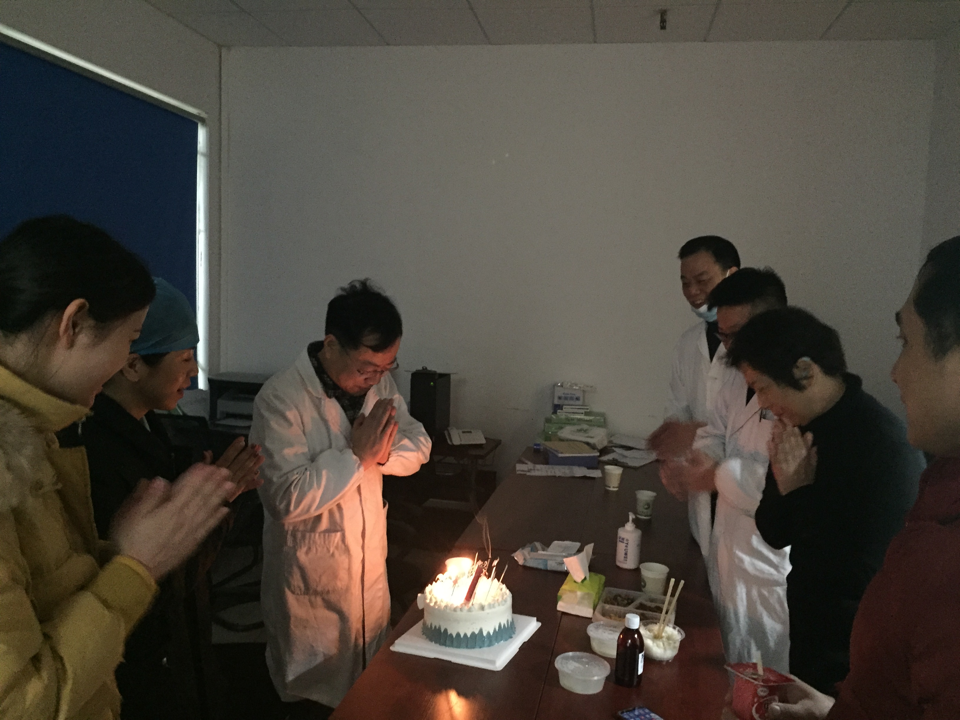 得知赵四林是大年初二生日,同事们悄悄准备了生日蛋糕,在当天的调度会议之后,大家在临时休息室点上蜡烛,与赵医生一起过上了一个简单而意义非凡的生日。