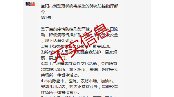 1月26日,“益阳市新型冠状病毒感染的肺炎防控指挥部令第1号”在微信圈群热传。经与我市新型冠状病毒感染的肺炎防控工作领导小组办公室核实,此消息为不实信息。当前,我市正全力以赴防控新型冠状病毒感染肺炎疫情。请市民注意自身防护,关注官方信息,不信谣,不传谣,不造谣。