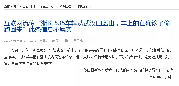 网传“浙BL0535车辆从武汉回蓝山,车上的人确诊了偷跑回来”,谣言!