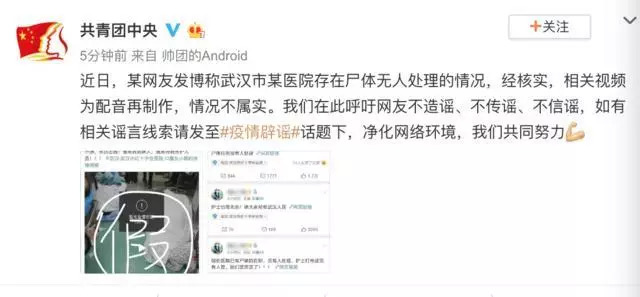 近日,某网友发博称武汉市某医院存在尸体无人处理的情况,经核实,相关视频为配音再制作,情况不属实。