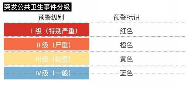 据悉,根据突发公共卫生事件的性质、危害程度、涉及范围,突发公共卫生事件划分为一般(Ⅳ级)、较大(Ⅲ级)、重大(Ⅱ级)和特别重大(I 级)四级。