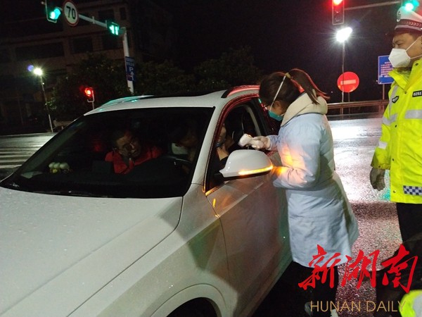 △大年三十晚,南岳区值守人员对车辆和人员进行摸排和体温监测。文兰 摄