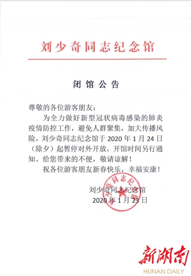 华声在线1月24日讯(湖南日报·华声在线记者 李曼斯)今天,刘少奇同志纪念馆发布闭关通告,于2020年1月24日(除夕)起暂停对外开放,开馆时间另行通知。此次闭馆旨在全力做好新型冠状病毒感染的肺炎疫情防控工作,避免人群聚集,加大传播风险。