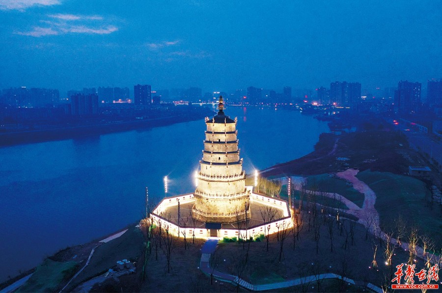 1月21日晚,衡阳市石鼓区,被灯光照亮的来雁塔重新焕发光彩。历经一年时间的修缮,来雁塔于1月20日全面竣工,成为湘江、耒水、蒸水三江交汇处的一颗靓丽明珠。该塔已有400余年历史,是湖南省重点文物保护单位。罗茂盟 摄