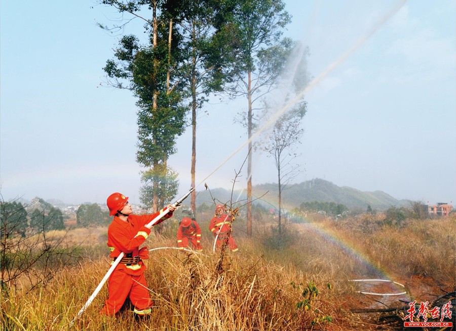 上图:1月21日,嘉禾县珠泉镇马托村山头,消防队员在演练扑灭“山火”。