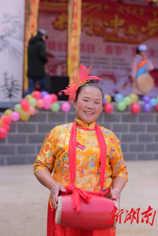 正聊着,“村晚”主持人宣布,下一个节目是《打起花鼓唱山歌》。“月月乐”舞蹈队登台。