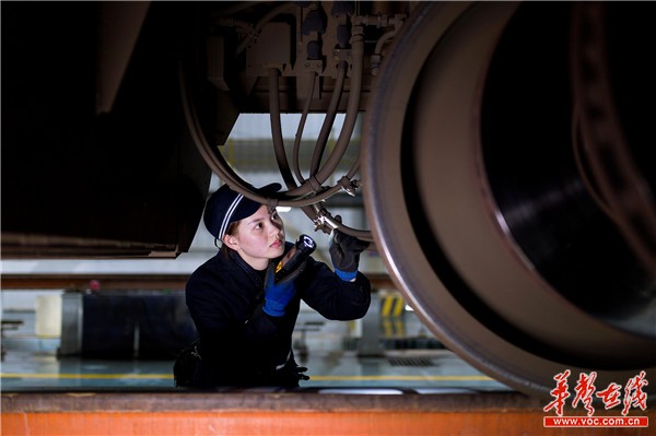 华声在线1月21日讯(记者 龙腾 通讯员 王极)“检修库第5股道复兴号1车车底应答器底板铁丝出现断裂,请处理。”“检修班组收到,马上过来处理。”1月21日凌晨2时40分,在湖南长沙动车运用所里,90后向念正在对一列复兴号车载设备进行检测。