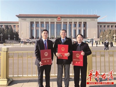 1月10日,在2019年度国家科学技术奖励大会上,中南大学土木工程学院三任院长余志武(中)、谢友均(右)、何旭辉(左)同时获奖。图为3人在人民大会堂前合影留念。 通讯员 摄