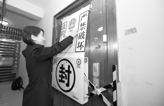 1月8日,长沙市曙光家园小区,芙蓉区人民法院执行法官正用电子封条对被执行人名下房屋进行查封。图/记者金林
