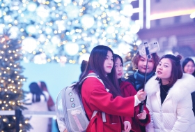 2019年12月24日晚,长沙解放西路附近,女孩们正在自拍。作为国内知名“网红”城市,夜晚的长沙华灯璀璨,总是吸引人们拍拍拍。图/记者吴琳红