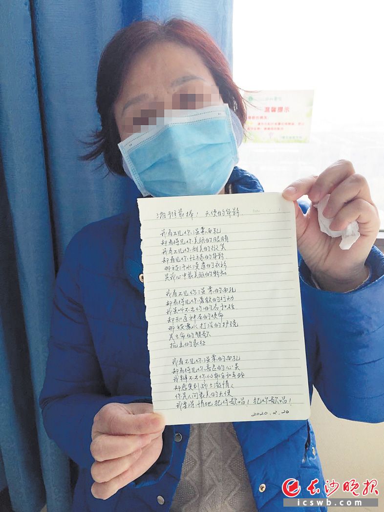长沙晚报2月25日讯(全媒体记者 彭放 通讯员 曹岚 张磊)“我看不见你温柔面孔,却看得见你美丽的眼睛……我虽叫不出你的名和姓,却知道神圣的使命……”近日,在武汉协和医院西院区湘雅病房,治愈出院的陶女士创作诗歌《天使的身影》,为中南大学湘雅医院医护团队点赞。