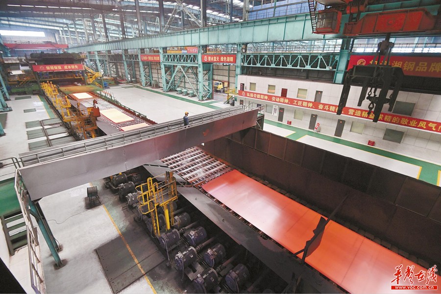 2月24日,湖南华菱湘潭钢铁有限公司5米宽厚板厂,全自动化生产线正在运行。目前,该公司订单火爆,生产经营稳定有序,铁、钢及钢材产品的产量均高出预期水平。湖南日报·华声在线记者 童迪 摄