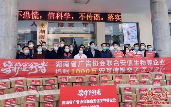 华声在线2月24日讯(记者 周培)为致敬战斗在一线的医务人员,湖南省广告协会、安信生物科技联合新潮传媒、乐购传媒等多家广告企业共同发起了“守护逆行者——1000万安可信银离子医疗物资捐赠”活动。2月24日上午,首批物资捐赠交接仪式在湖南省红十字会举行。