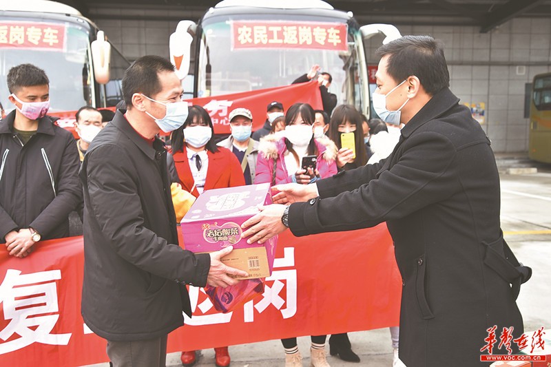 2月22日,溆浦县举行务工人员返岗爱心专车送行仪式,第4批106名务工人员乘坐4辆爱心专车赴浙江返岗。就业保障部门还为大家准备了方便面、矿泉水、口罩、防疫汤剂等物资,让大家顺利返岗上班。 戴靓 摄