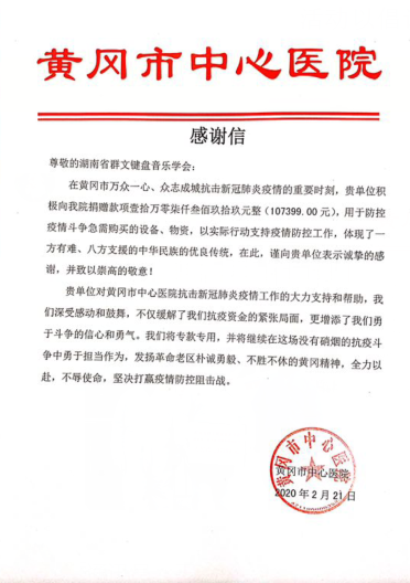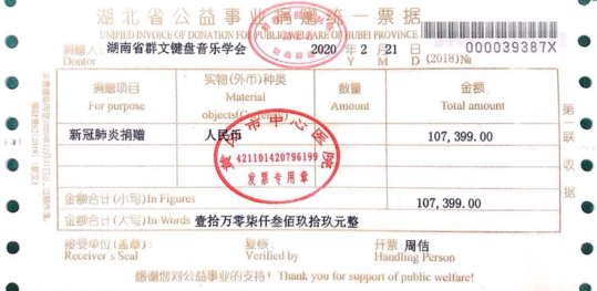 活动结束,键盘专业委员会立即将善款全部汇入湖南省政府指定的对口支援单位一一湖北黄冈市中心医院,接到善款后,该院院长表示,此项捐款将全部用来购买急需的医疗物资。当天下午该院发来收款凭证及感谢信。