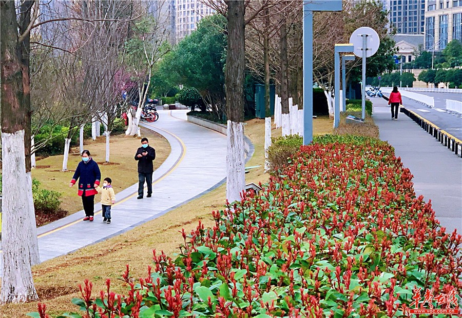 2月20日,长沙梅溪湖畔百花争艳、绿草茵茵,市民漫步休闲,尽享和煦春光。