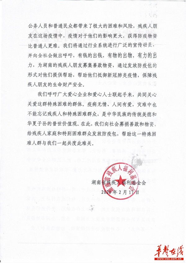 华声在线2月20日讯 ( 通讯员 刘彦彦) “新冠肺炎疫情发生以来,残疾人群体在疫情防控中处境尤为困难,需要格外关心、关注。”今日,省残疾人福利基金会副理事长、秘书长谢华柏表示,从2月1日起至今,基金会已安排近100万元资金,在长沙、株洲、岳阳、益阳、怀化等市州开展防疫工作,确保残疾人生活、健康安全。