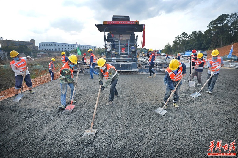 2月14日,长益高速扩容工程长沙市望城区段,工人在加紧进行路面基层摊铺。当天,长益高速扩容工程第8合同段(长沙段)在做好疫情防控和安全防范工作后,科学安排人员有序进场施工,确保工程进度。