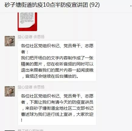 砂子塘街道“抗疫10点半”微信宣讲群正式上线,第一场是由金地社区二支部书记、宣讲团成员曹述球用手机录制的防疫故事。一经推出上线,立马刷爆微信群。