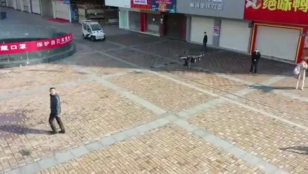 “大哥”扭头往天上看,一架黑色无人机正“盯着”他,听到来自“黑科技”的劝导,随后配合地从口袋里拿出口罩,乖乖戴了起来。
