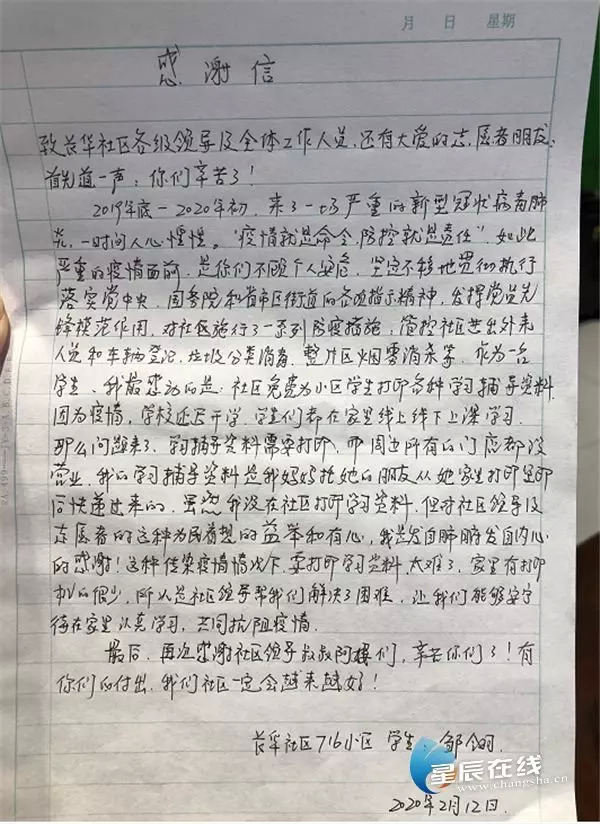 “感谢社区为我们提供这么暖心的服务,让我们能够安宁待在家里认真学习,共同抗阻疫情。”湖南师大附中博才实验中学(湘江校区)高一年级学生邹翎在感谢信中说道。