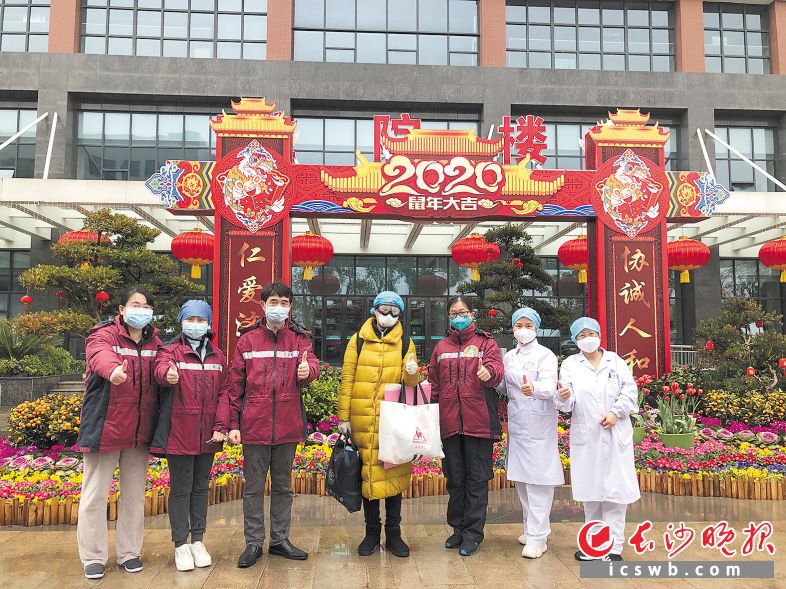 14日,湘雅医疗团队欢送曾女士(左四)出院。 医疗队供图