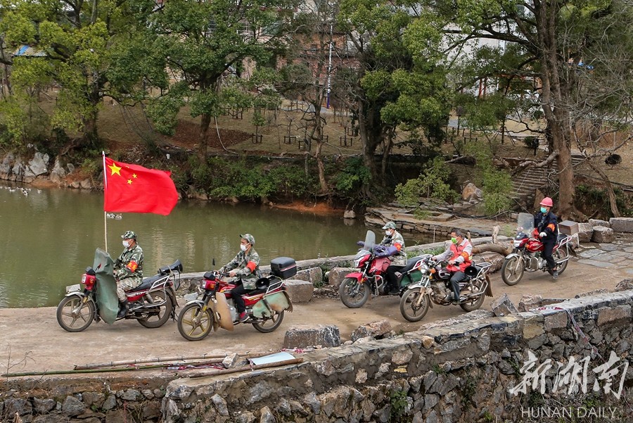 2月14日,临武县南强镇高安水村,镇防疫流动巡查队队员出发前往各村巡查。连日来,该镇39名防疫流动巡查队员分别在全镇广宜、土桥、南强三片区,对车辆及人员严格排查,把好“外防输入,内防扩散”关。陈卫平 摄