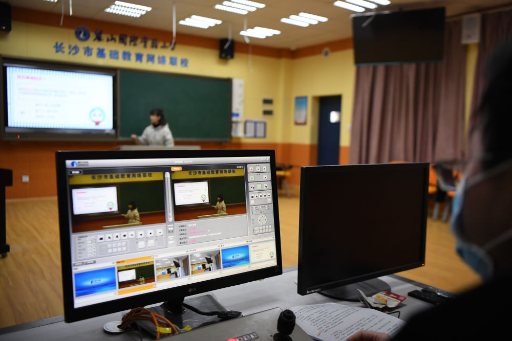 2月10日,长沙麓山国际实验小学技术人员在教室内通过电脑监控网络课程直播情况。 新华社记者 薛宇舸摄