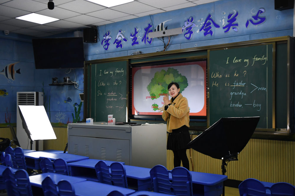 2月10日,长沙麓山国际实验小学英语老师黄宁在教室内直播网络课程。 新华社记者 薛宇舸摄
