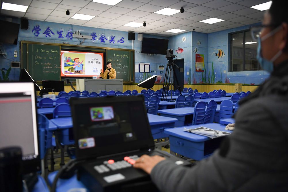 2月10日,长沙麓山国际实验小学英语老师陈辉在教室内通过摄像头直播网络课程。 新华社记者 薛宇舸摄