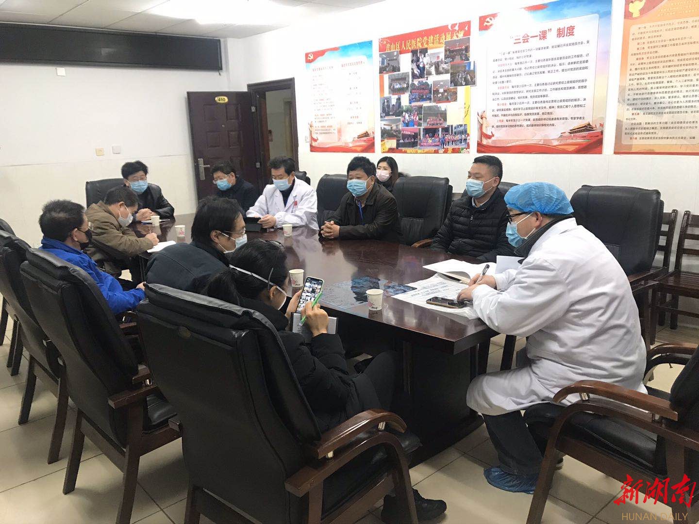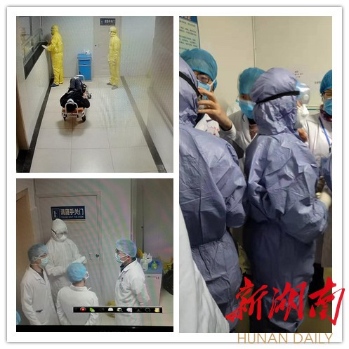 15时,“战地医院”会议室里,市卫健委副主任刘志敏和市一医院、市二医院、君山区人民医院的专家商讨着救治方案。