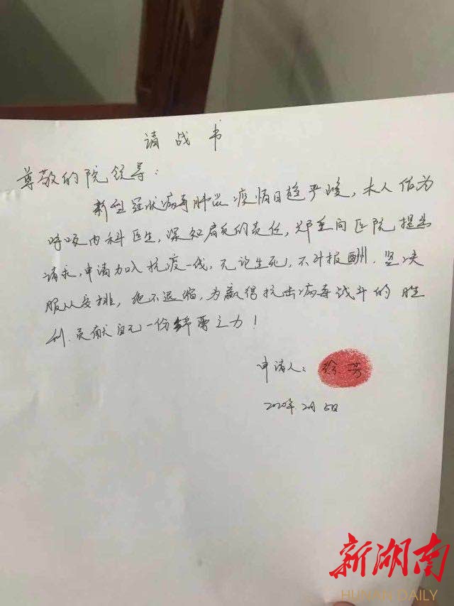 “我申请加入抗疫一线,不论生死,不计报酬,绝不退缩……”这是君山区人民医院呼吸科医生徐芳的请战书。1月29日,她曾与新冠病毒短兵相接,面诊出该区首位疑似病例。徐芳回忆道:“病毒传染性强,谁都会怕。但是作为医生,面对患者遭受病魔侵袭时,就由不得想那么多了。”