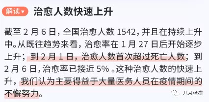 这篇文章在对全国疫情趋势进行解读时透露,截至2月6日,全国新冠肺炎患者已治愈1542例(到2月7日为2050例)。从既往趋势来看,治愈率在1月27日后开始逐步上升,到2月1日,治愈人数首次超过死亡人数。到2月6日,治愈率已接近5%。