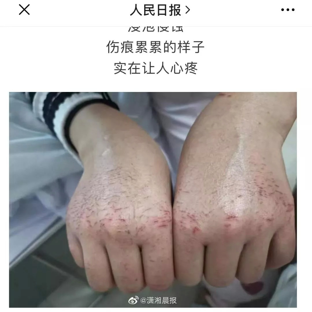 这是一双22岁年轻护士的手,但受到消毒液、洗手液、滑石粉浸泡侵蚀,伤痕累累,已经完全看不出这是一双属于爱美的年轻女孩的手,让人心疼!
