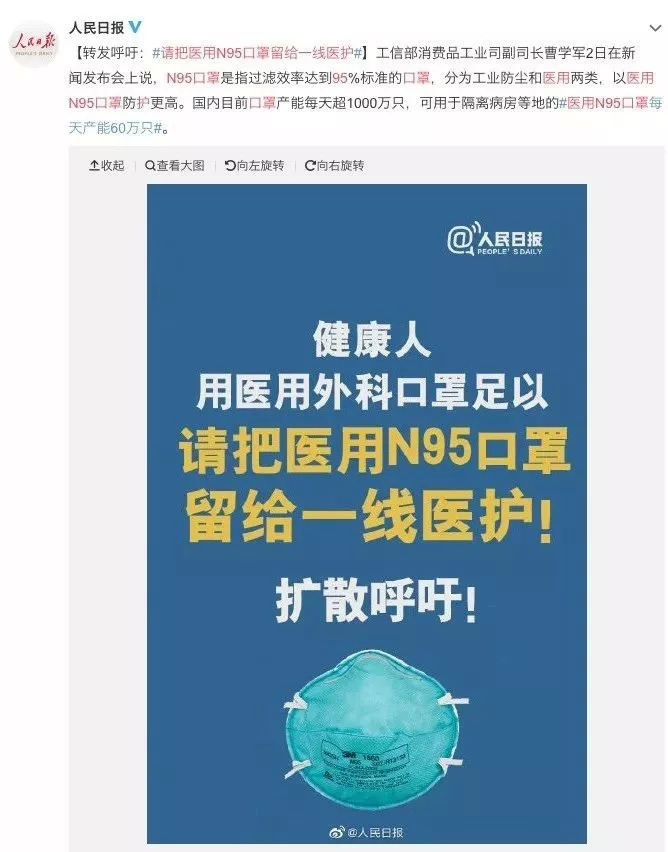 2月3日,微博上有个热门话题#请把医用N95口罩留给一线医护#,这个话题迅速获得6000多万点击,2万多人参与。