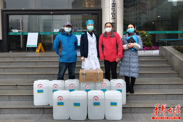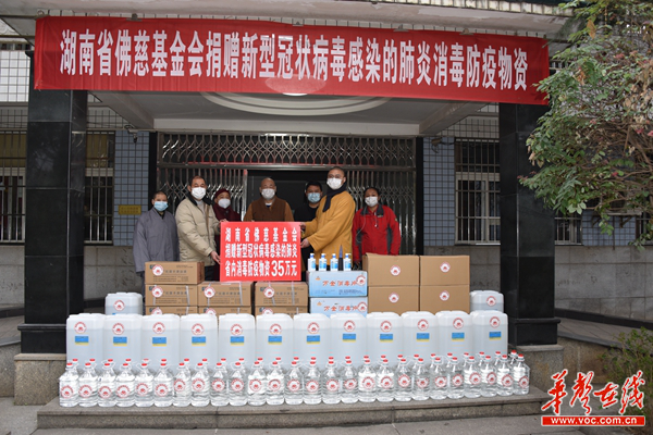 (2月7日上午,湖南省佛慈基金会捐赠新型冠状病毒感染的肺炎消毒防疫物资仪式在基金会办公室前举行。)