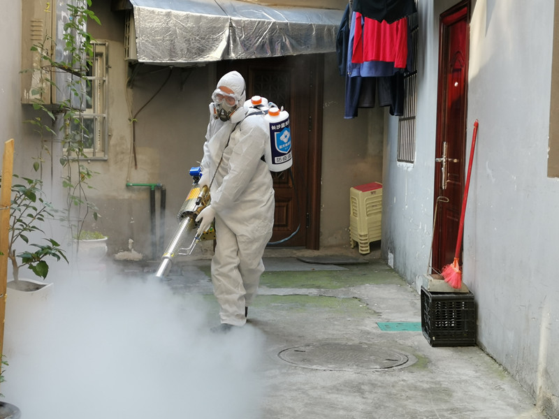 一道道白色的身影在小区里面穿梭进行消毒杀菌,每扇门的门把,每一条小路旁的雕像,路边的垃圾桶都不放过;从33楼到负3楼,每一层,每一个台阶,他们就这样一层层走下来,队友们很快憋出了一身汗。3个小时后,大家取下面罩,脸上的汗水和压痕清晰可见,却没有一个人有怨言,下午他们还要赶往另一个社区。