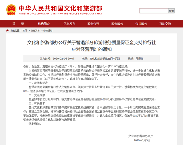 华声在线2月7日讯(记者 刘思佳)近日,为缓解疫情下旅游企业经营困难,进一步做好文化和旅游系统疫情防控工作,文化和旅游部办公厅下发《文化和旅游部办公厅关于暂退部分旅游服务质量保证金支持旅行社应对经营困难的通知》(以下简称《通知》),决定向旅行社暂退部分旅游服务质量保证金。暂退范围为全国所有已依法交纳保证金、领取旅行社业务经营许可证的旅行社,暂退标准为现有交纳数额的80%。被法院冻结的保证金不在此次暂退范围之内。自《通知》印发之日起两年内,接受暂退保证金的各旅行社应在2022年2月5日前将本次暂退的保证金如数交还。