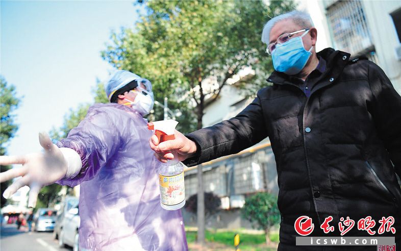 张运祥给村医妻子当司机,每天监测60多人次,就给她消毒60多次。 长沙晚报通讯员 张迪 摄