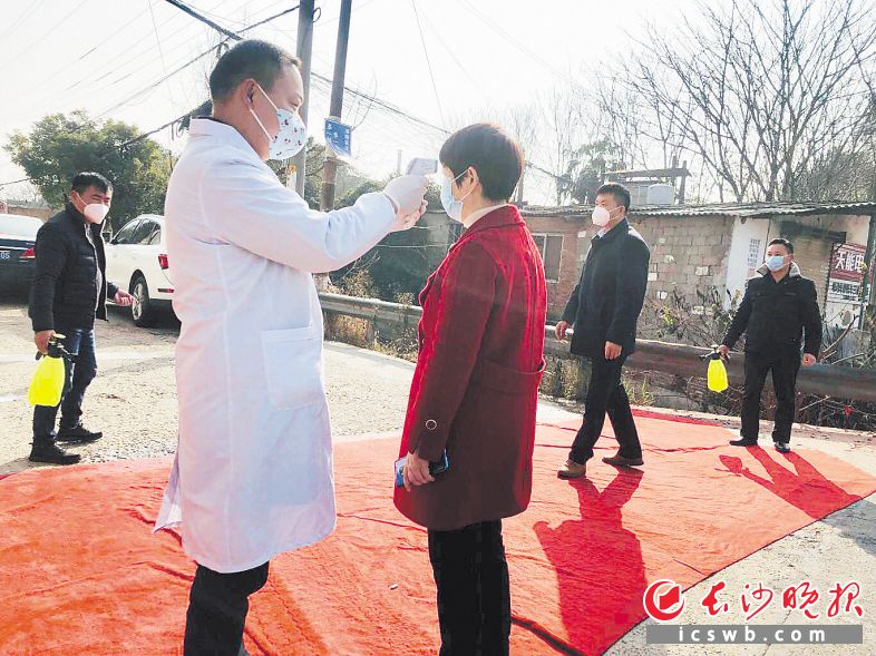 防疫人员给走过红地毯进村的人员检测体温。长沙晚报通讯员 胡恒帅 摄