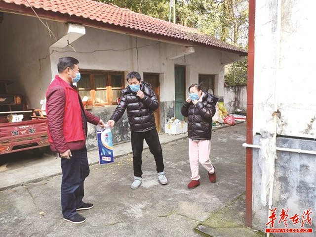 常德汉寿黄福社区支部书记彭连宝为曹桂海夫妇送生活必需品。通讯员 供图