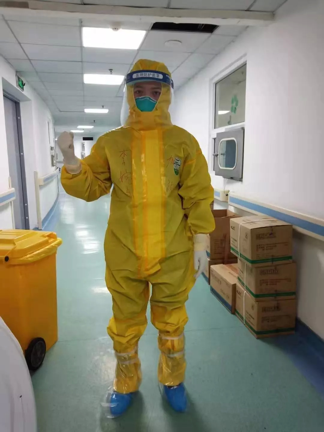 昨天,我穿着防护服给病人做血液透析治疗的时候,头发全部汗湿了,汗水从脖子一直流到后背,衣服全都湿透了。几乎每个人都是一边喘气一边工作!大家都在坚持着。