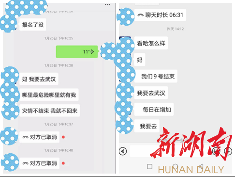 华声在线2月4日讯(特约记者 唐金生 通讯员 吴凤花 吴铭森 王梓亦)“妈,我要报名,我要上前线,哪里有危险哪里就有我,灾情不结束我就不回来。”1月26日,龙璇给正在抗“疫”前线的妈妈发了一个特殊的微信,微信里她主动请战,要求去武汉抗“疫”前线做一名志愿者。
